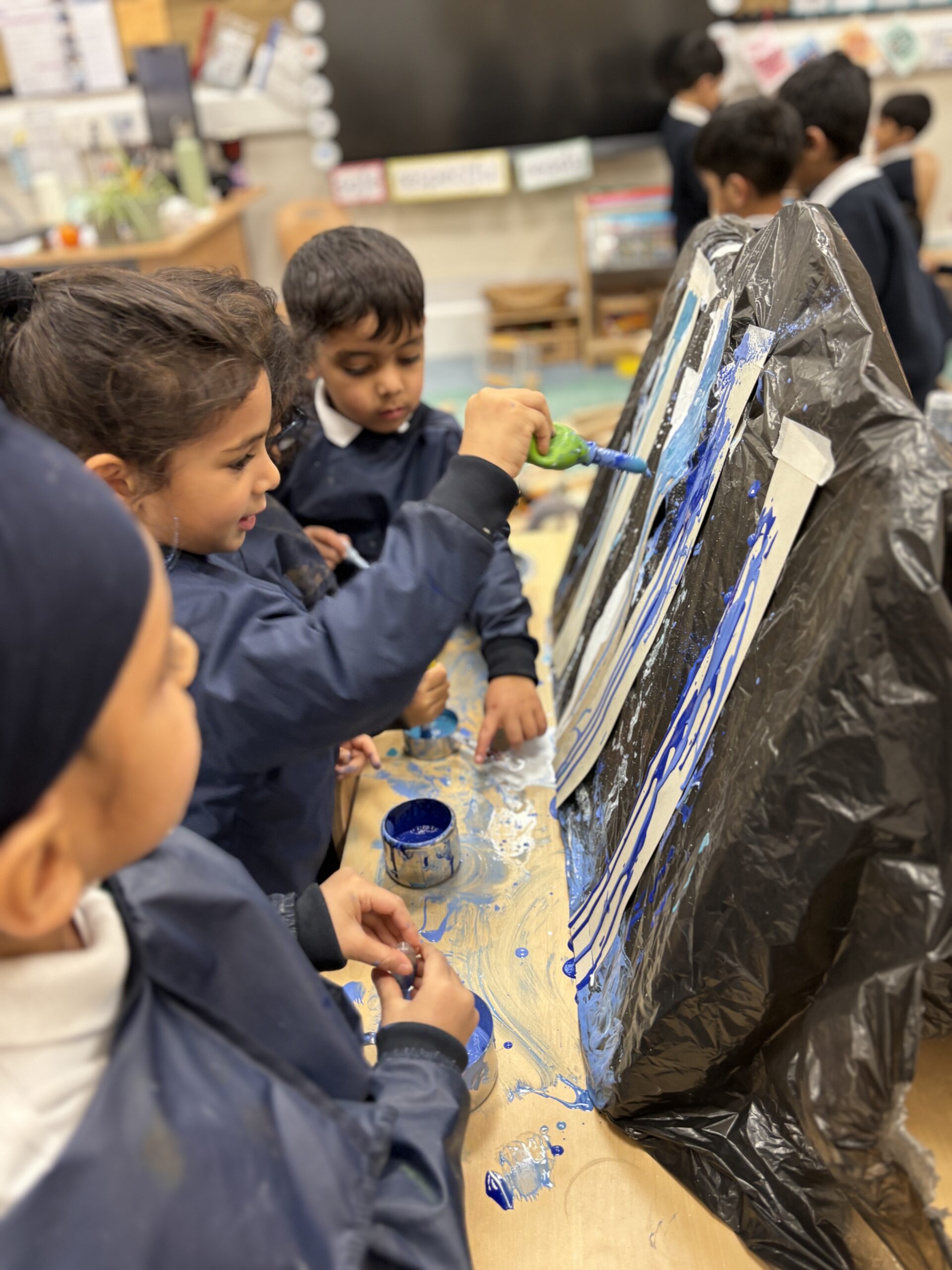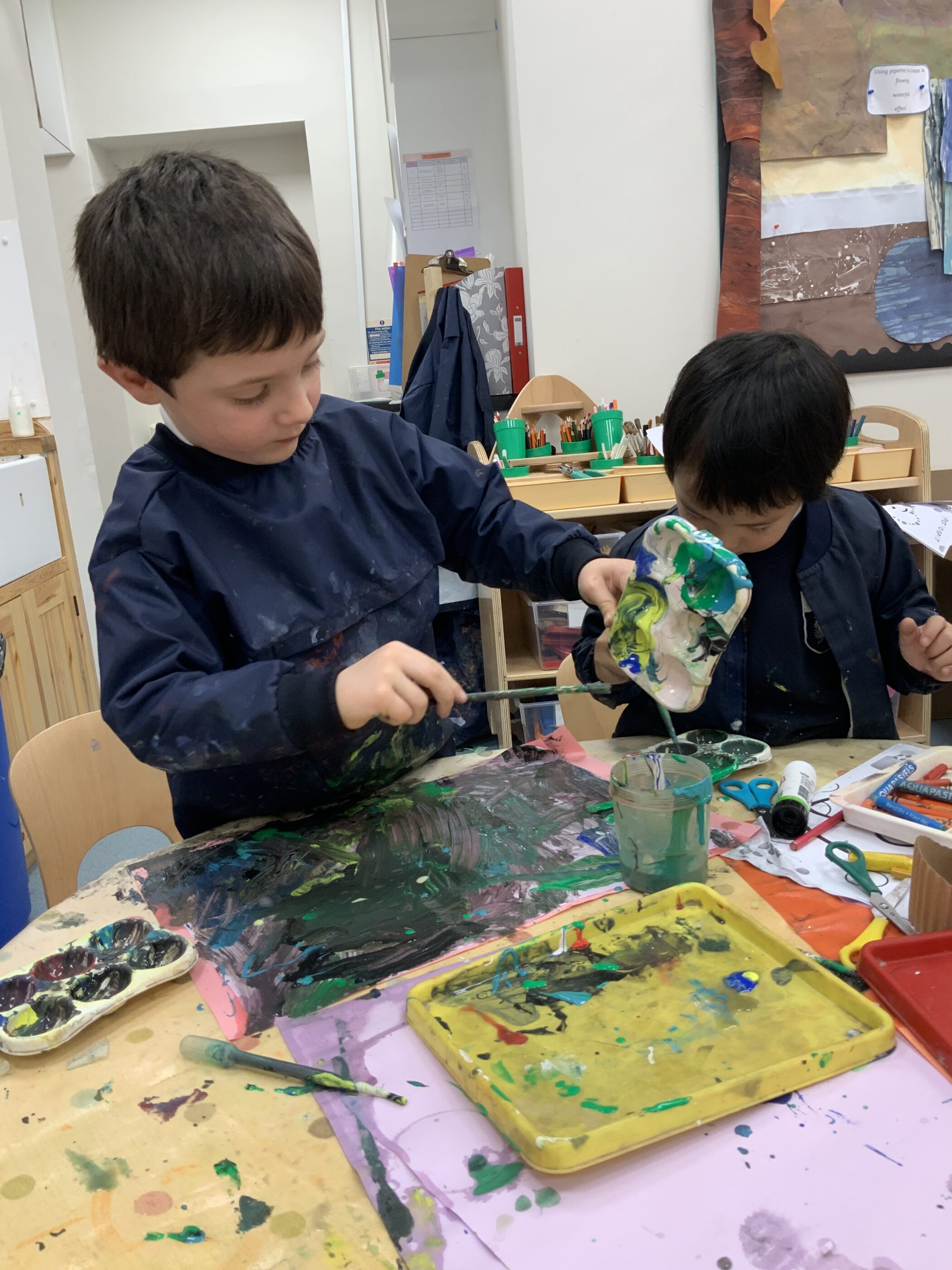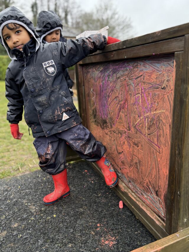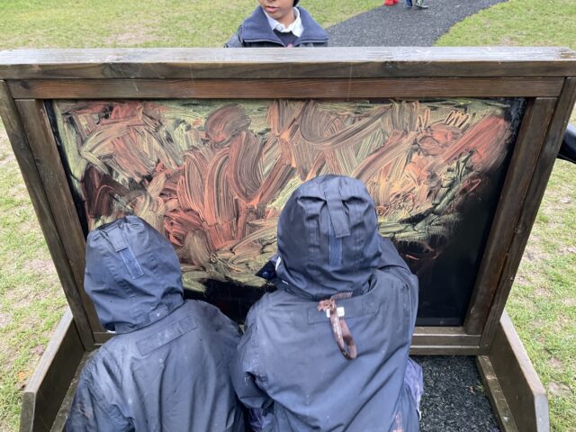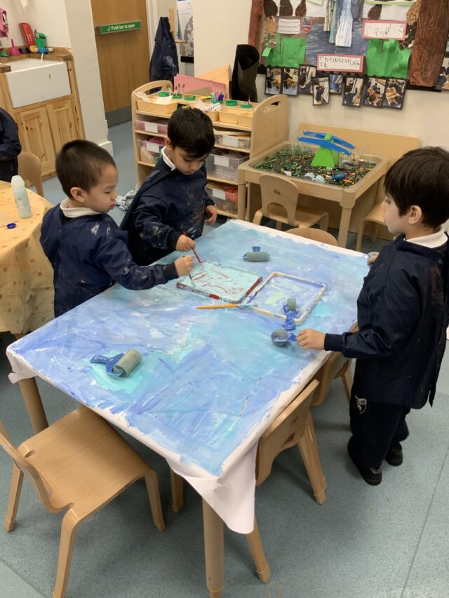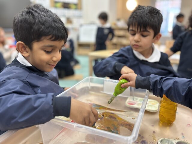 They experimented with different painting tools such as pipettes, brushes and rollers, watching how each one created exciting patterns and textures. Outside, the boys got wonderfully messy mixing mud, water and stones to build imaginative dinosaur habitats. They were also fascinated to see what happened when they mixed oil with water and paint to create colourful lava lamp effects. Through all this playful experimenting, the boys have been discovering how materials behave while taking risks and developing their curiosity and imagination.
